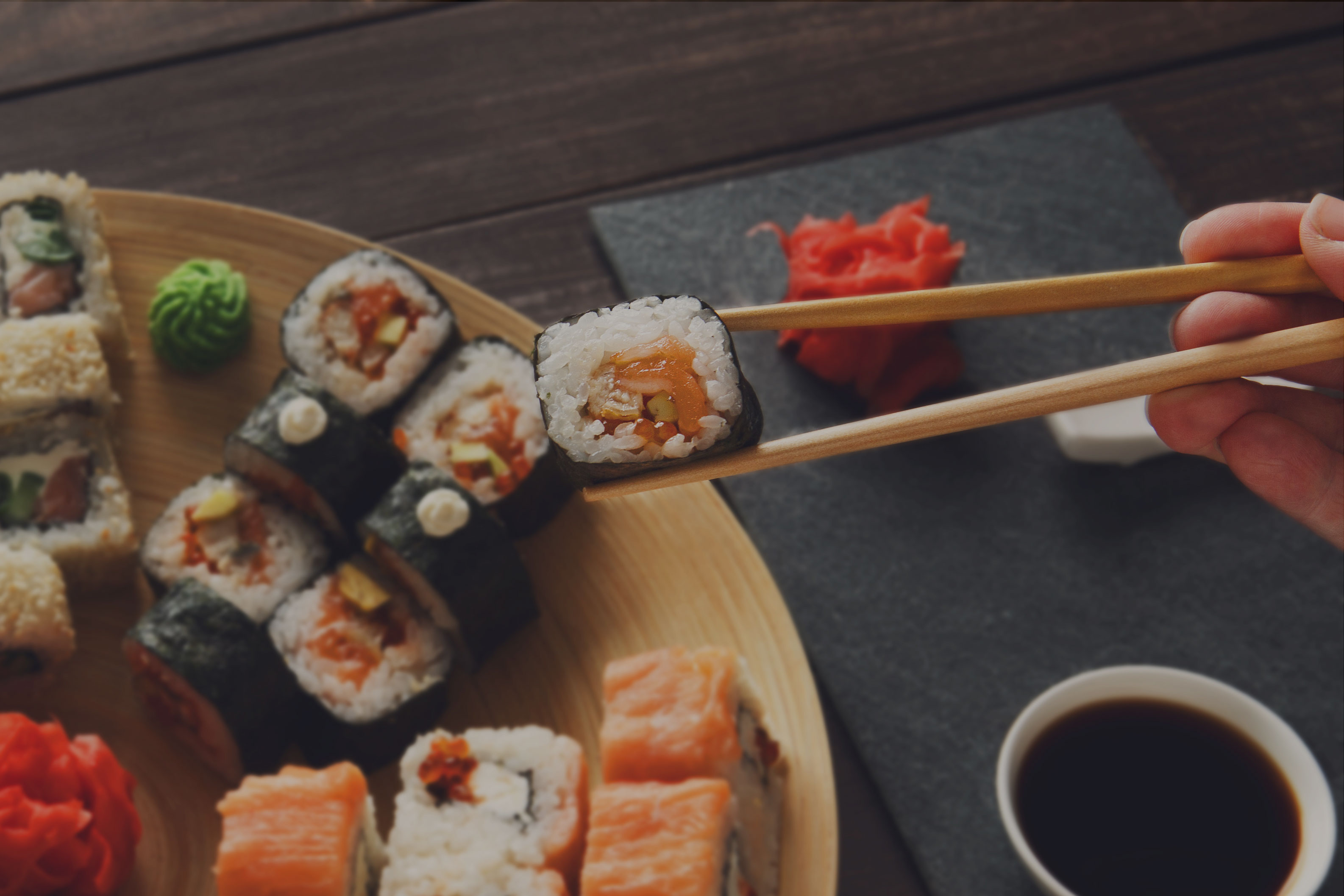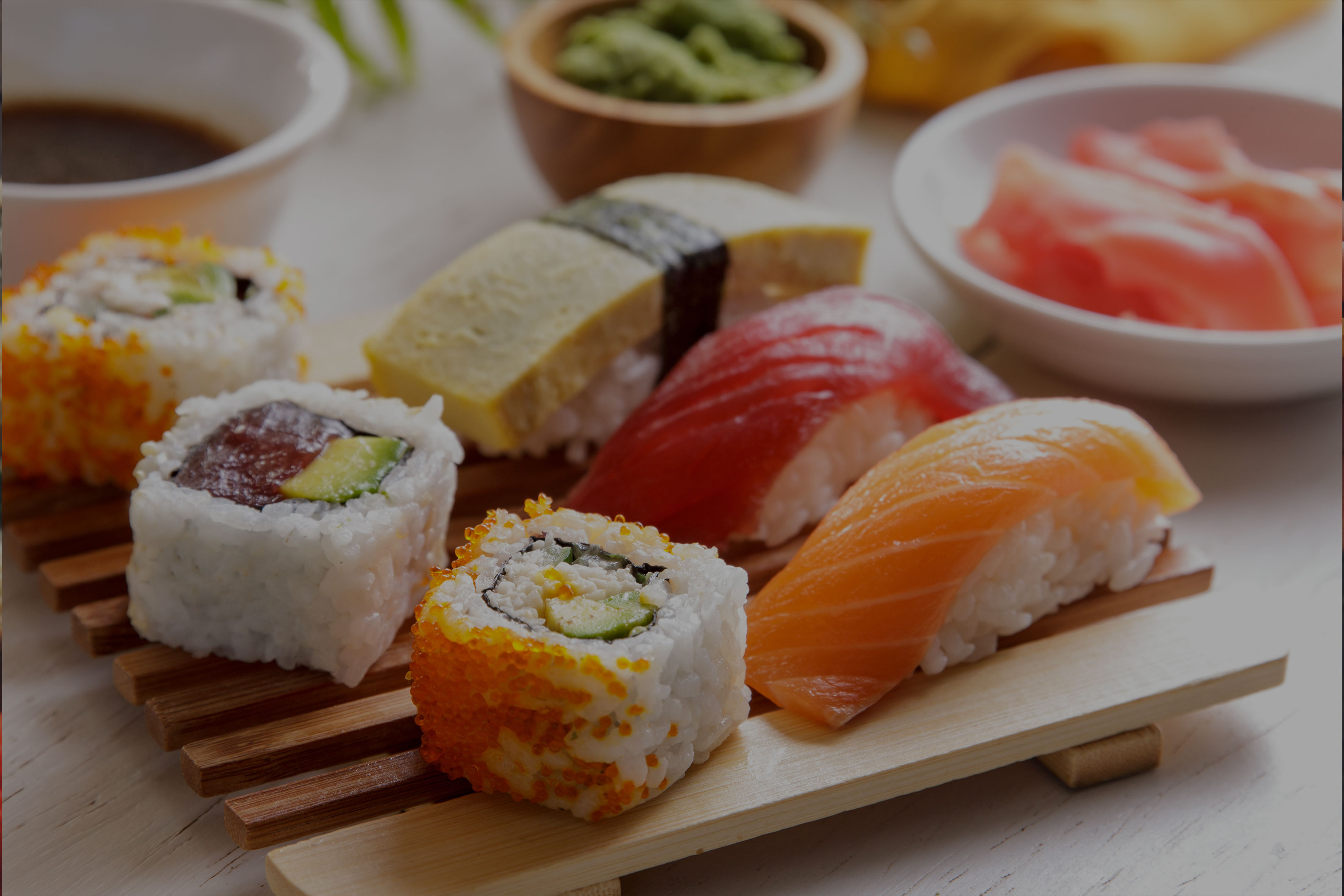eel, avocado, tuna, salmon, yellow tail, fluke, fish egg